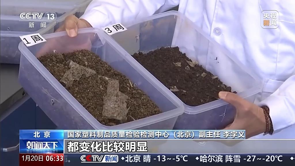 大陸國家塑膠製品品質檢驗檢測中心(北京)副主任李字義指出:看第一周,堆肥和樣品混合後狀態是這樣。整個樣品比較大,從第二周開始,發生變化。堆肥顏色還有樣品大小也都發生變化,從第三周後,變化越來越明顯,可看第一周和第三周。非常明顯,從顏色還有塑膠袋本身變化比較明顯,到第六周,樣品就幾乎看不到。而且堆肥體積也明顯減少。